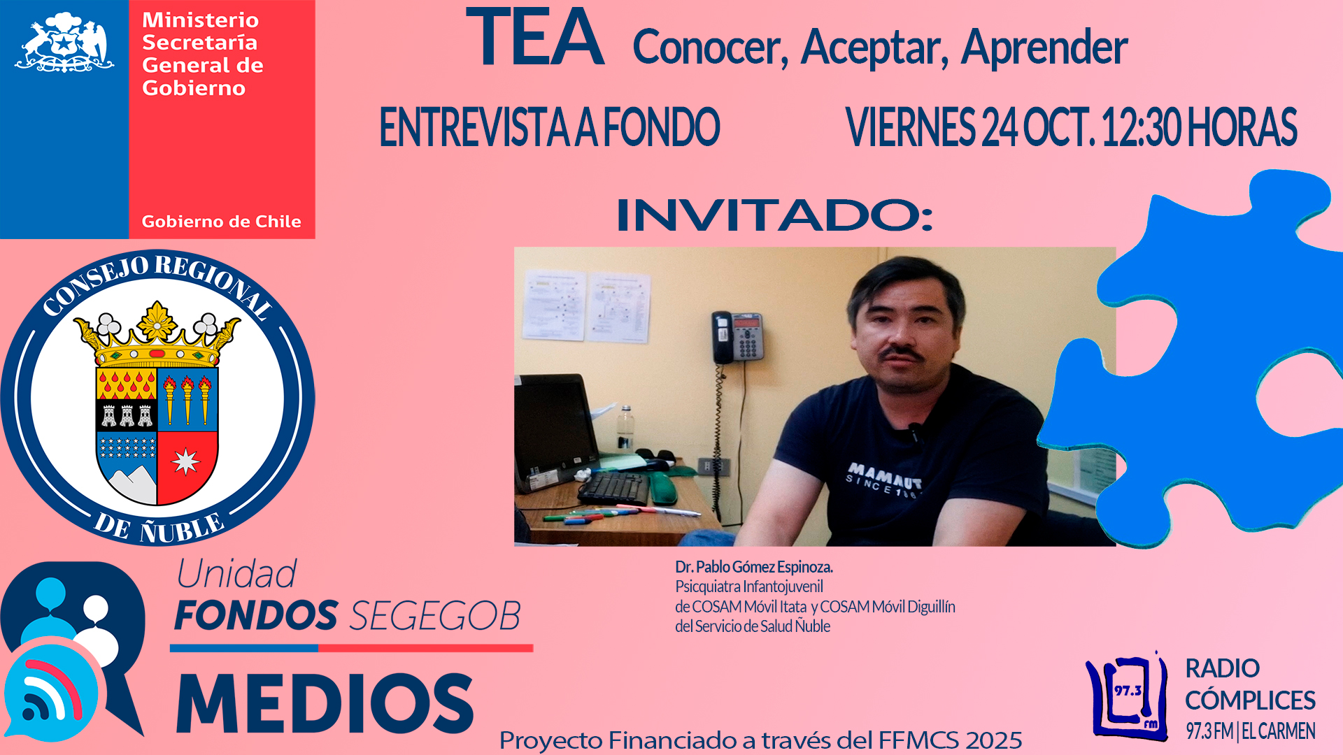 #FFMCS2025. Este viernes 24 de octubre se realizó el Programa denominado: “TEA, Conocer, Aceptar y Aprender”, un proyecto financiado por el Fondo de Fomento de Medios de Comunicación Social del Gobierno de Chile y del Consejo Regional de Ñuble. En esta quinta entrevista, en esta oportunidad nos acompaño: el Doctor Pablo Gómez Espinoza, Psiquiatra InfantoJuvenil, […]